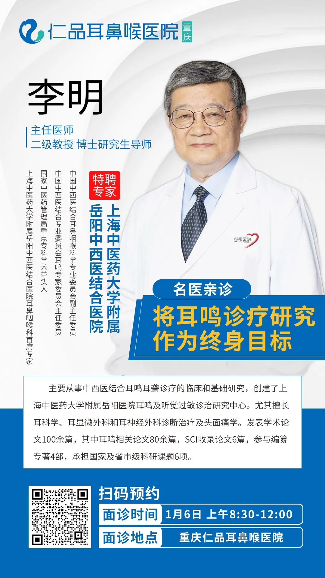 耳鸣作为世界医学界难题,发病机制复发,很多患者辗转多家医院,身心俱疲还效果甚微。为了让重庆耳鸣患者在家门口就能和国内顶尖耳鸣专家“零距离”,我院邀请国家中医药管理局耳鼻咽喉重点专科学术带头人,上海中医药大学附属岳阳医院耳鸣中心首席专家李明教授于2024年1月6日来重庆仁品耳鼻喉医院坐诊,名额仅6个,预约从速!