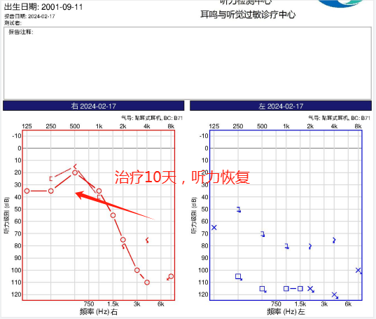 2天的治疗后,小雪说可以听到声音了,治疗第6天,医生为小雪进行了听力测试,听力已恢复到之前的水平。但为了巩固疗效,小雪和家人决定坚持做完一个疗程。