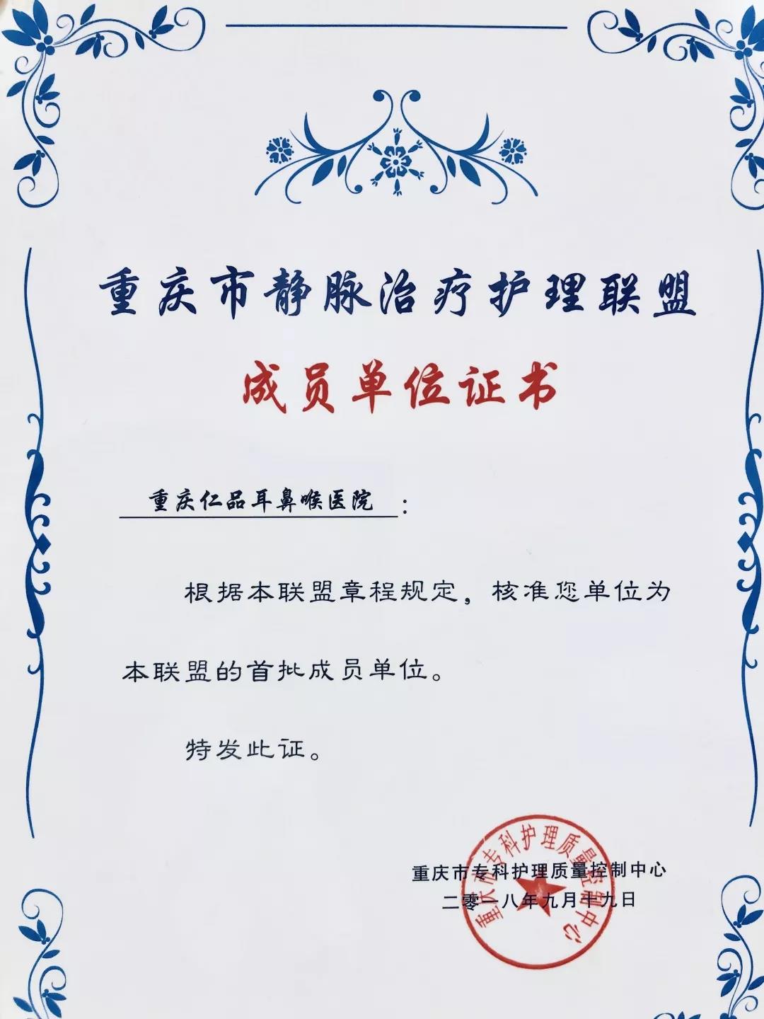据了解,重庆市静脉治疗护理联盟于2018年9月19日经重庆市专科护理质量控制中心批准,由重医附一院护理部牵头成立。重庆仁品耳鼻喉医院作为第一批联盟成员单位,将积极践行国家卫生健康委发布的《静脉治疗护理技术操作规范》,积极为我市静疗专科的质量与水平添砖加瓦,为广大静疗患者的安全、健康保驾护航。